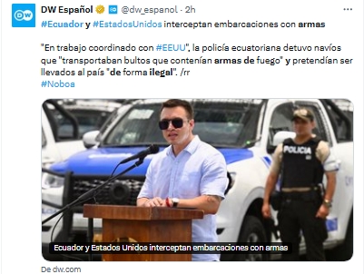 La Policía Nacional de Ecuador, en coordinación con autoridades de Estados Unidos, interceptó embarcaciones en altamar que transportaban bultos con armas de fuego destinadas a ingresar ilegalmente al país, informó el ministro del Interior, John Reimberg.