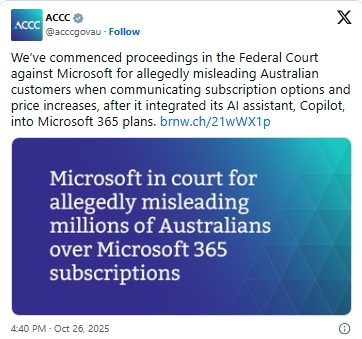 La acción legal fue interpuesta ante la Corte Federal contra Microsoft Australia y Microsoft Corp., acusando a la empresa de emitir mensajes “falsos o engañosos” a unos 2,7 millones de suscriptores de planes con renovación automática de Microsoft 365, que incluyen diversos servicios digitales.