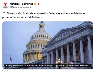 La Federación Estadounidense de Empleados Gubernamentales (AFGE), que representa a cerca de 800,000 trabajadores federales, instó a los legisladores demócratas a aprobar un presupuesto provisional que permita reabrir el Gobierno de Estados Unidos. El sindicato advirtió que el cierre está afectando gravemente a miles de empleados y servicios públicos esenciales, y pidió un “acuerdo temporal” mientras continúan las negociaciones sobre el financiamiento a largo plazo.
