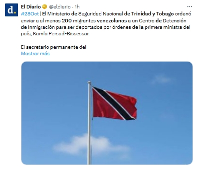 Trinidad y Tobago deportará a 200 inmigrantes venezolanos en situación irregular, en medio de tensiones con Venezuela por la presencia de tropas estadounidenses y disputas energéticas.