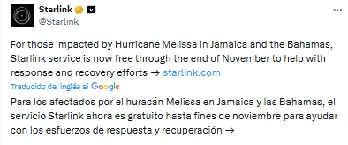Starlink, de SpaceX, ofrecerá Internet satelital gratuito a los afectados por el huracán Melissa en Jamaica y Bahamas hasta fines de noviembre, para apoyar las labores de respuesta y recuperación tras el paso del ciclón de categoría 5.