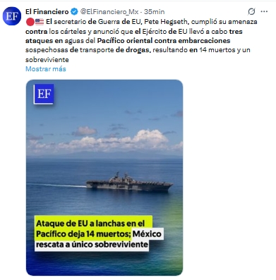 El secretario de Guerra, Pete Hegseth, informó en X que los operativos dejaron 14 presuntos “narcoterroristas” muertos y un superviviente. En su mensaje, Hegseth defendió las operaciones como parte de la respuesta estadounidense al tráfico de estupefacientes y prometió seguir localizando y atacando a las organizaciones responsables.
