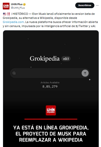 El empresario Elon Musk presentó este lunes Grokipedia, una nueva plataforma que busca competir con Wikipedia y que combina el modelo conversacional de inteligencia artificial Grok con una base de conocimiento desarrollada por su empresa xAI. Actualmente, está disponible la versión 0.1 del sitio, que según Musk “ya es mejor que Wikipedia”.