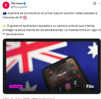 Las principales plataformas digitales TikTok, Snapchat, Facebook, Instagram y Threads notificarán en los próximos días a más de un millón de adolescentes australianos sobre la nueva medida que prohíbe el uso de redes sociales a menores de 16 años a partir del 10 de diciembre, convirtiendo a Australia en el primer país del mundo en aplicar una restricción de este tipo.