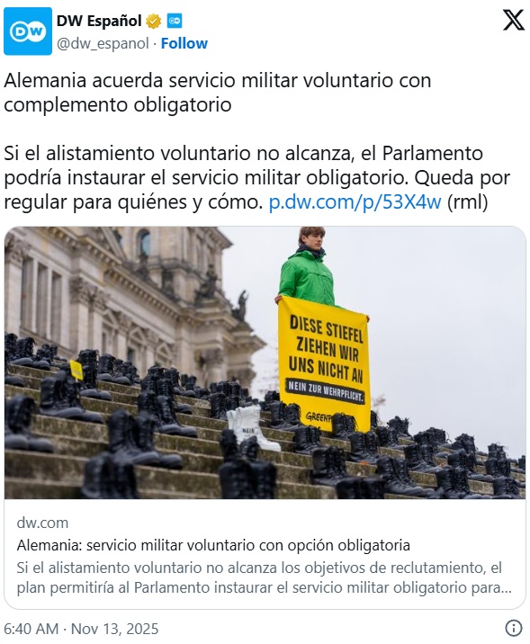 Tras meses de un debate político, que incluye la protesta de organizaciones pacifistas, y un aumento de consultas en los centros de asesoramiento para personas que no quieren hacer el servicio militar en Alemania, los partidos de la coalición gobernante acordaron anoche un proceso de reclutamiento obligatorio como parte de un controvertido nuevo modelo de servicio militar, según informaron en conferencia de prensa.
