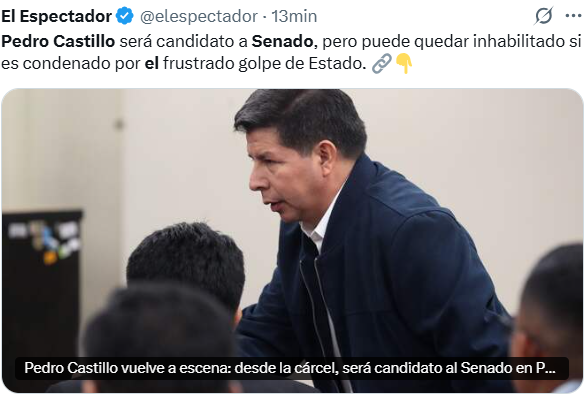 Castillo confirmó la postulación a través de un mensaje publicado en su cuenta oficial en la red social X, administrada por su equipo, debido a su condición de recluso mientras enfrenta un juicio por su fallido intento de golpe de Estado.