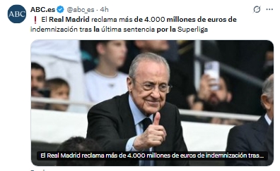 El Real Madrid y A22 Sports Management, promotora de la Superliga, anunciaron que demandarán a la UEFA por 4.500 millones de euros (unos 5.200 millones de dólares), alegando perjuicios económicos, lucro cesante y daño reputacional causados por el bloqueo al proyecto.