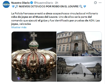 La fiscal de París, Laure Beccuau, informó que cinco nuevos sospechosos fueron detenidos en relación con el robo de joyas del Museo del Louvre. Los arrestos se realizaron simultáneamente en París y en el departamento de Seine-Saint-Denis la noche del miércoles.