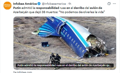 El presidente ruso, Vladimir Putin, admitió por primera vez que las defensas aéreas de Rusia derribaron un avión de Azerbaijan Airlines en diciembre de 2024, causando la muerte de 38 personas. Según su explicación, los misiles disparados contra un dron ucraniano explotaron cerca del avión, que se disponía a aterrizar en Grozni, Chechenia.