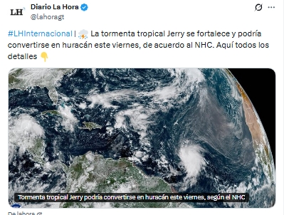 La tormenta tropical Jerry, formada el pasado martes 7 de octubre, continúa fortaleciéndose gradualmente mientras avanza por el océano Atlántico, según informó el Centro Nacional de Huracanes (NHC) de Estados Unidos.