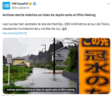 Las autoridades advirtieron sobre el alto riesgo de inundaciones y deslizamientos de tierra potencialmente mortales, ya que Halong, el vigésimo segundo tifón de la temporada, azotó la isla de Hachijo con vientos superiores a los 250 km/h y lluvias torrenciales.