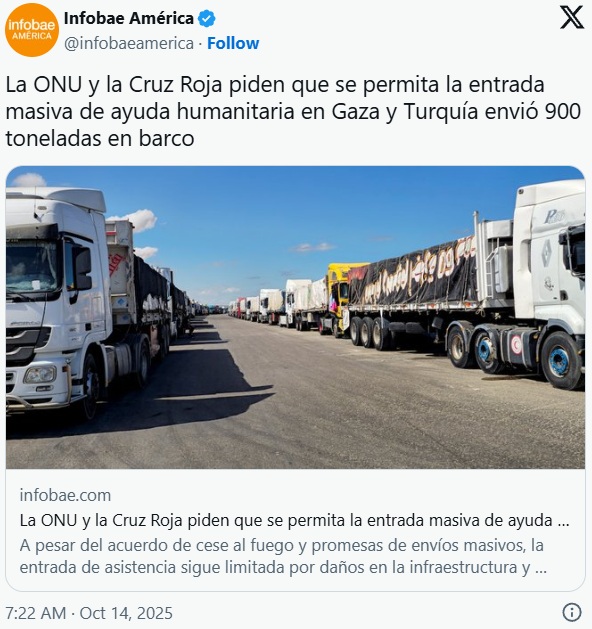 La Organización de las Naciones Unidas (ONU) y el Comité Internacional de la Cruz Roja (CICR) exhortaron a que los cruces estén operativos para facilitar la entrada de suministros esenciales, en el marco de la frágil tregua establecida bajo el plan del presidente de Estados Unidos, Donald Trump.