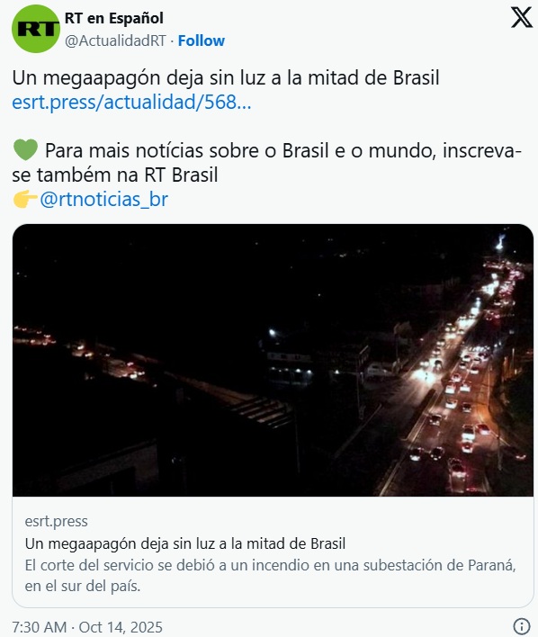 La madrugada de este martes se registró un apagón en el Distrito Federal y al menos ocho estados de Brasil, tras un incendio en un reactor de la subestación eléctrica de Bateias, en Campo Largo, en el estado de Paraná, en el sur del país.