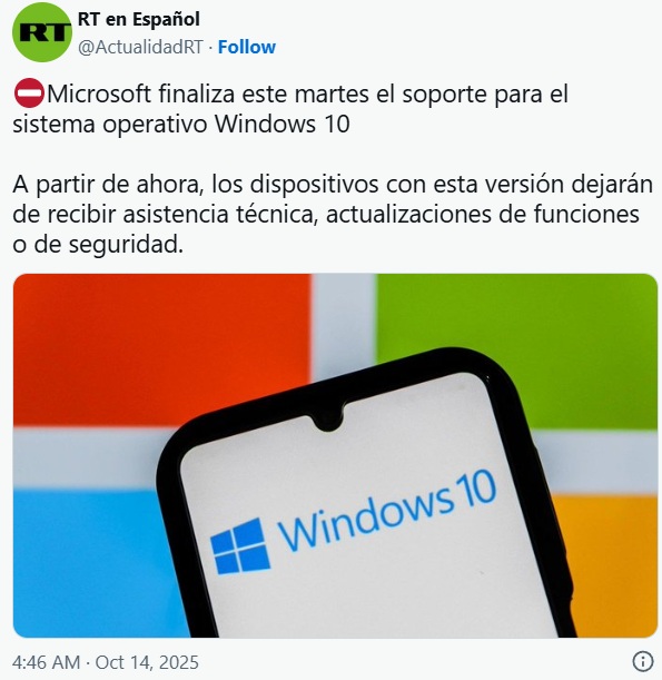 Microsoft finaliza este martes el soporte para el sistema operativo Windows 10. A partir de ahora, los dispositivos con esta versión dejarán de recibir asistencia técnica, actualizaciones de funciones o de seguridad.